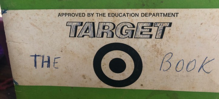 Something that particularly caught my eye was the exercise book with its handwritten title “THE BOOK”. It is a Target exercise book, and was apparently approved by the Education Department. ‘The’ and ‘Book’ were written each side of the Target picture, so whether it is meant to be “The Book” or “The Target Book” we will probably never know (Mum has denied all knowledge of the book or its contents, although her handwriting inside the book is a bit of a giveaway).