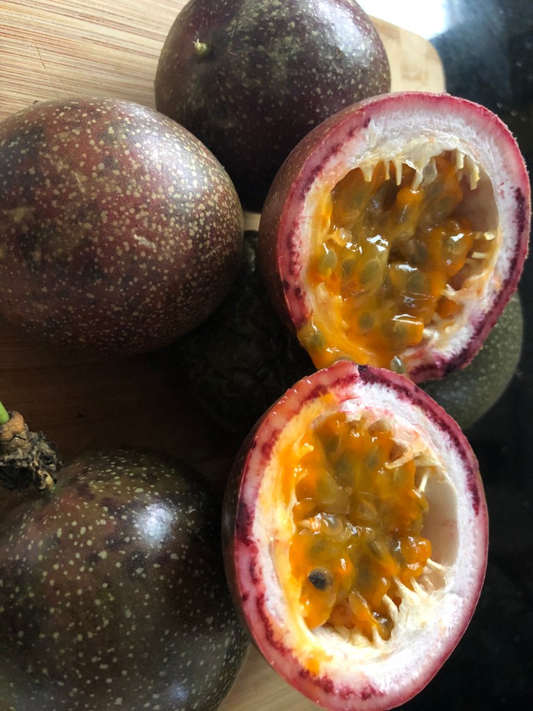 Ok that’s a bit of a stretch, but I sit here slurping passion fruit down my throat, from one of my 7 currently ripe passion fruit.