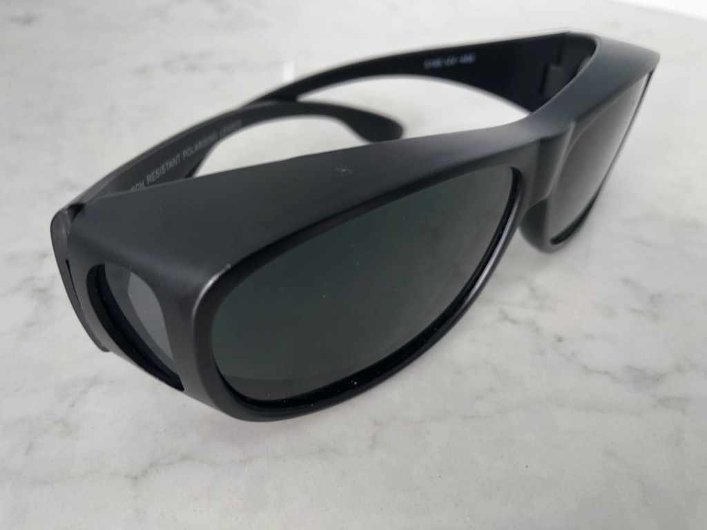 Light sensitivity is an expected symptom post surgery so I was supplied, on leaving the hospital, with a proper pair of sunglasses. These things are the ultimate in protecting the eye from the evil ultra violet rays – they look a little like a virtual reality headset, but they are very effective in keeping sunlight from my sore eyeball.