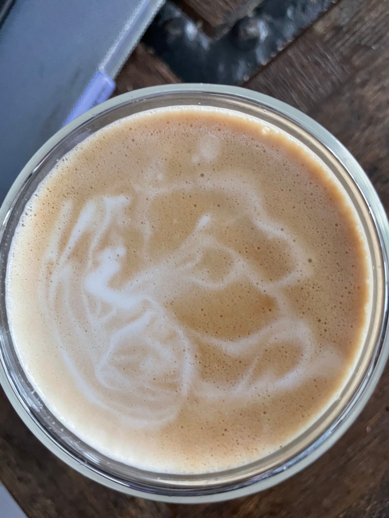 Every now and then, when pouring my freshly steamed milk into my coffee, I experiment with squiggles. I wouldn’t refer to it as latte art, because it definitely is not a recognisable picture. But I then give myself an amusing minute or so, before the coffee hits the mouth, trying to figure out what the ‘picture’ may be.